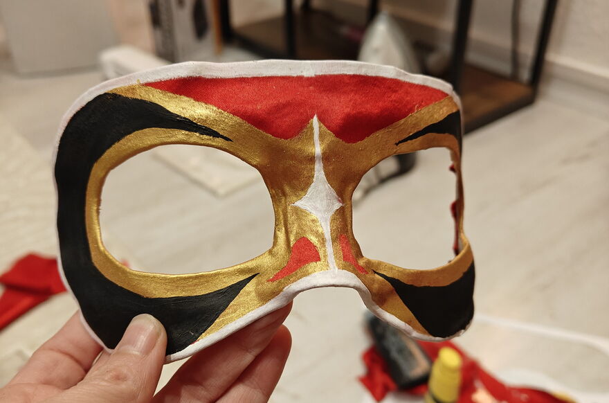 I had to apply multiple layers of white paint so the red fabric wouldn’t show through — this is why I recommend using white fabric if possible. Finally, I glued ribbons to the sides so I could tie the mask to my head.