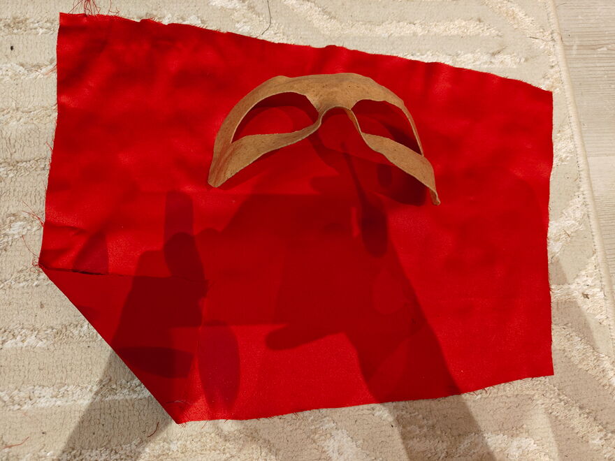 I covered the entire mask with a thin layer of glue, carefully laid the fabric on top, and pressed it down starting from the nose and moving outward to avoid wrinkles.